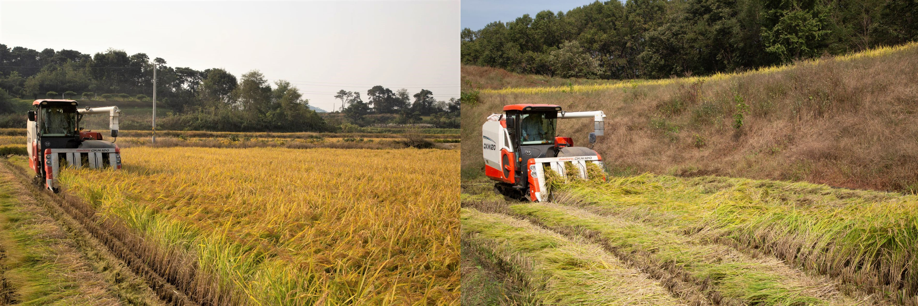 <사진1~3> 대동의 6조 콤바인 DXM120이 가을 수확철을 맞아 경기도 여주에서 벼를 수확하고 있다.