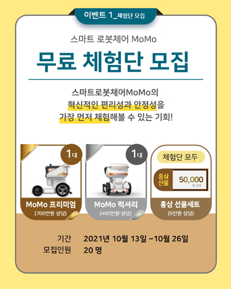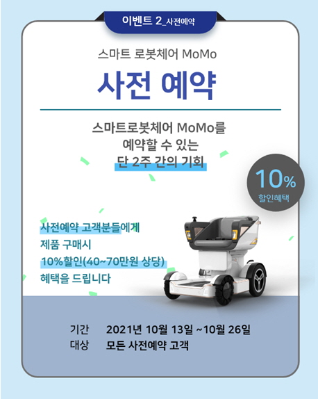 대동 스마트 체어 홈페이지(momo.daedong.co.kr)에서 오는 26일까지 사전 구매 예약 및 체험단 신청을 받는다. 사전 예약 고객은 10% 할인 혜택을 제공한다. 20명을 선발하는 체험단은 전원에게 스마트 로봇체어의 체험 기회와 함께 5만원 상당의 건강기능 식품을 증정한다. 또 2명을 추첨 해 내년 하반기 생산 예정인 스마트 로봇체어도 선물한다. 상세한 내용은 홈페이지에서 확인할 수 있다.