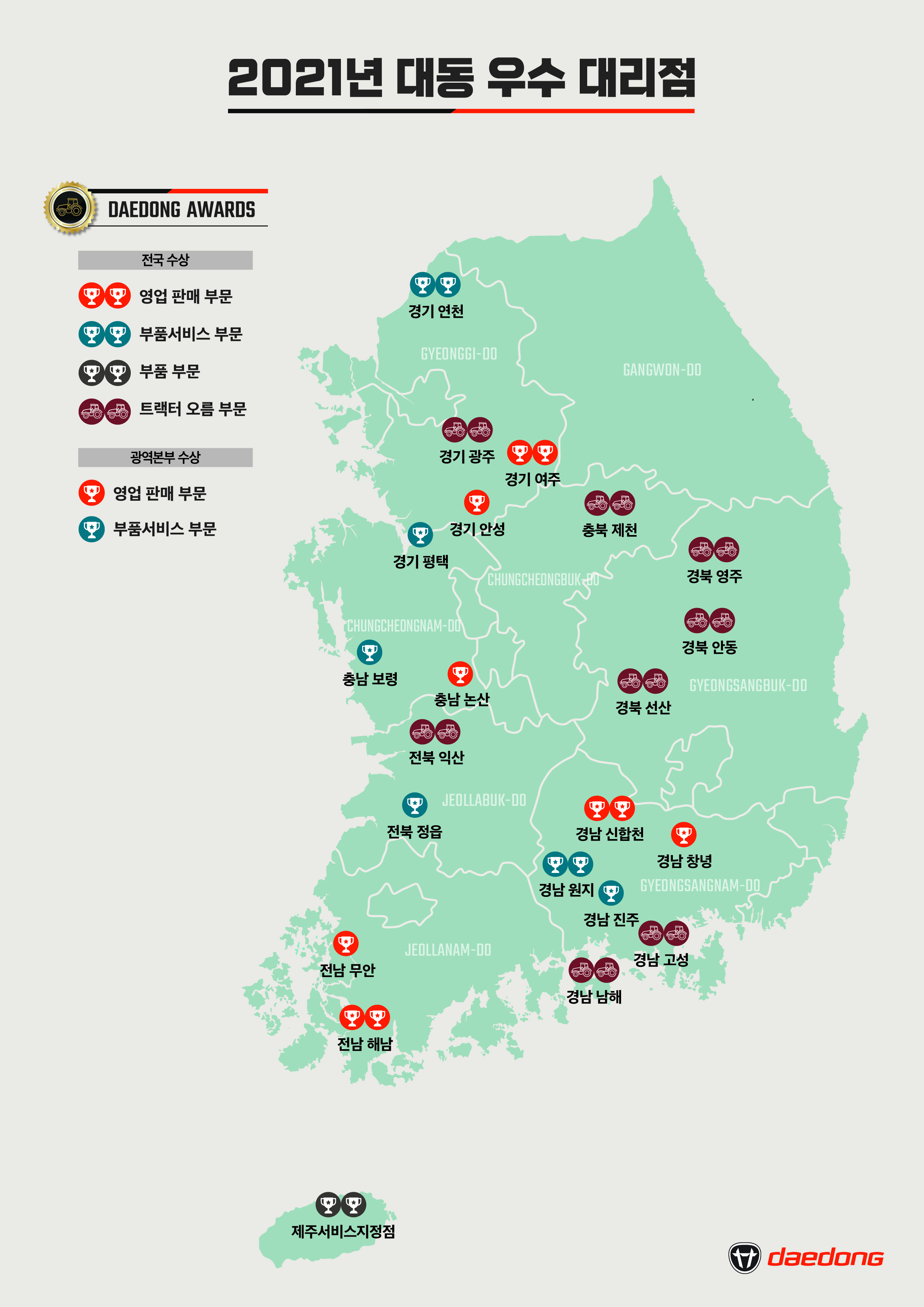 ①영업 판매 부문은 판매 실적과 서비스 역량을 기준으로 평가해 ▲대상 전남 해남 ▲최우수 경기 여주 ▲우수 경남 신합천 등이 수상했다. ②부품서비스 부문은 대리점의 서비스 역량을 중점 평가해 ▲최우수 경남 원지 ▲우수 경기 연천이 수상의 영예를 안았고 ③부품 부문에서는 ▲최우수 제주서비스지정점이 선정됐다. 지역 농기계 시장에서의 대동 트랙터 점유율 신장 기준으로 수여하는 ④트랙터 오름 부문에는 ▲경기 광주 ▲충북 제천 ▲전북 익산 ▲경북 선산/영주/안동 ▲경남 남해/고성 등 총 8개 대리점이 상을 받았다.