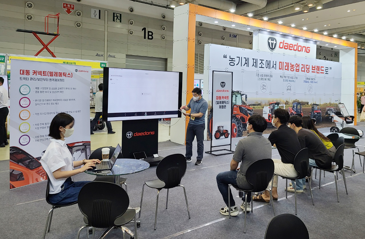 대동은 이번 박람회에서 참가사 중 최대 부스인 360㎡ 규모의 전시 공간에 ‘미래농업 리딩 브랜드’를 주제로 부스를 설치했다. 텔레메틱스 기반에 모바일로 농기계 원격 관제 및 점검을 하는 ‘대동 커넥트(Connect)’ 서비스를 올해 하반기 중소형 트랙터에도 적용하면서 ‘커넥트 체험존’을 만들어 관람객의 체험을 유도했다. 이와 함께 이 서비스를 채택한 대동의 플래그쉽 모델인 국내 최초 직진자율주행 트랙터 HX1300(132마력)을 비롯해 연평균 1천대 이상 판매되는 대동의 스테디셀러 RX시리즈의 하나인 RX630(64마력) 트랙터, 하우스 전용 DK550(55마력) 트랙터를 전시했다.
