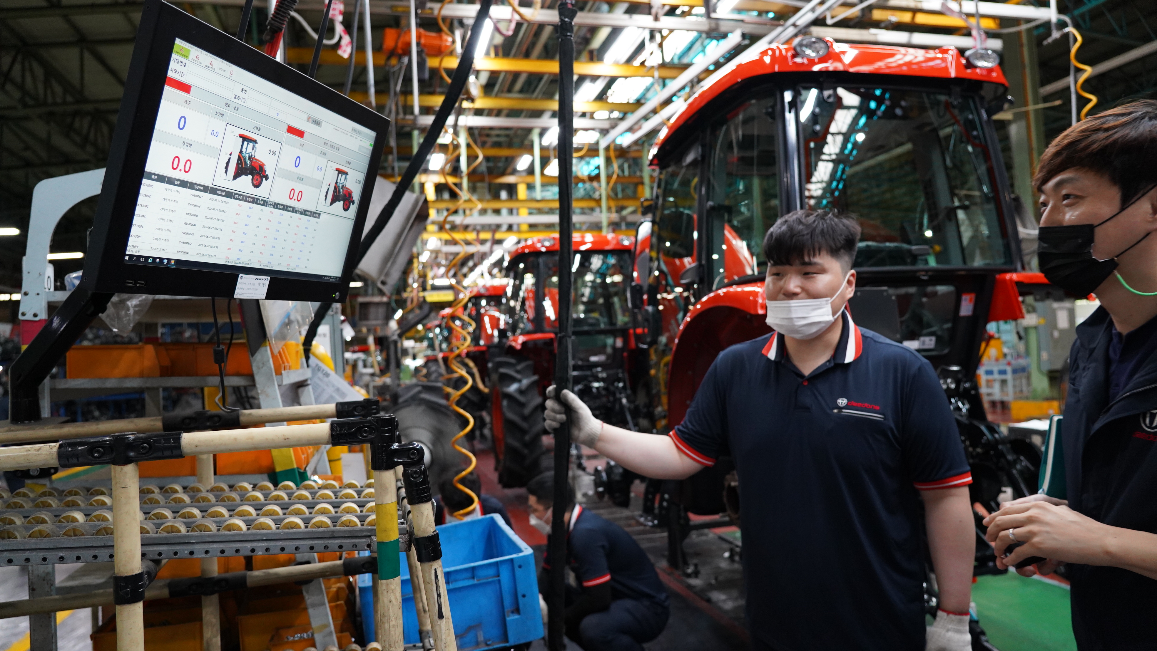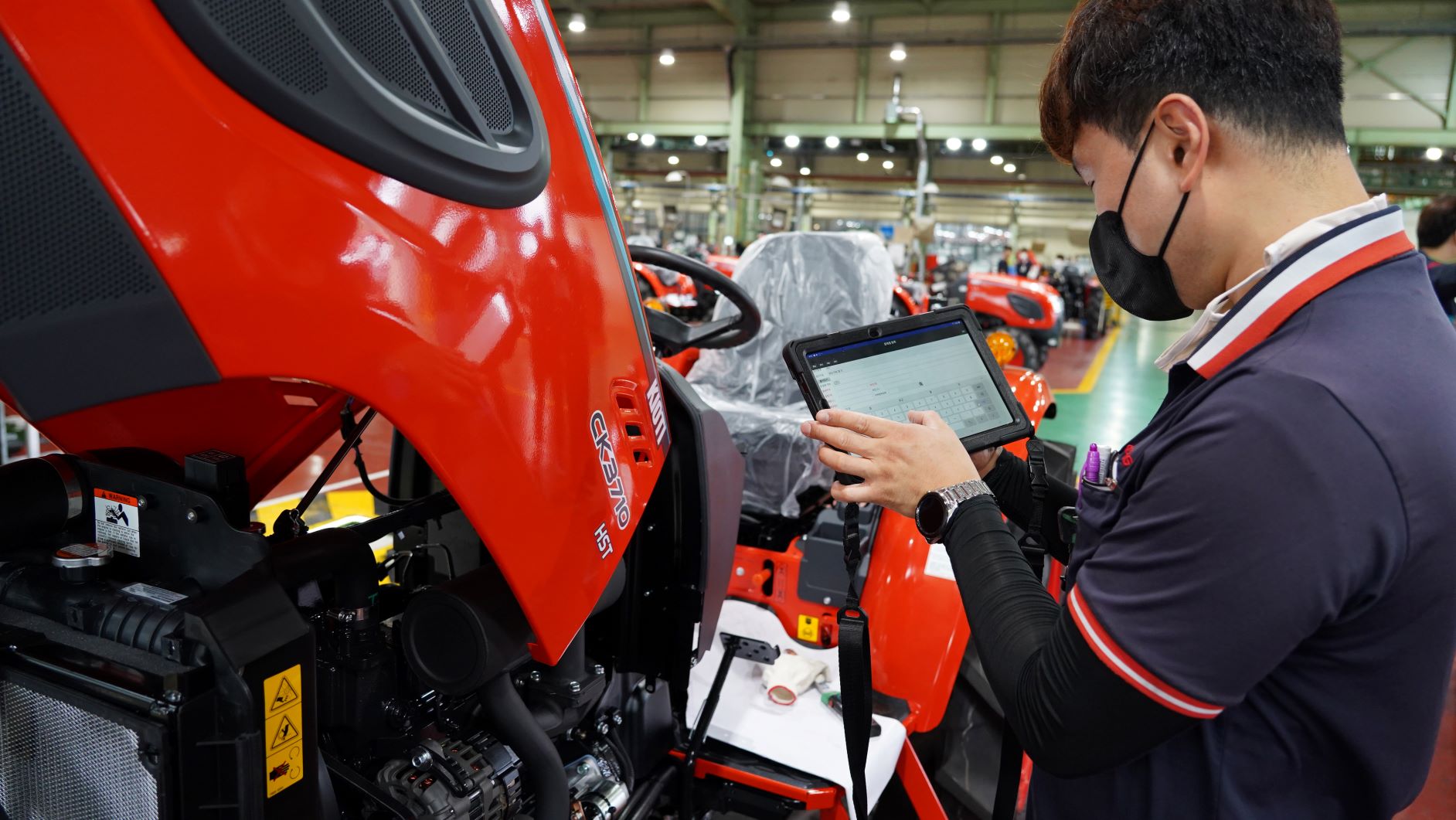 대동이 세계 수준의 생산 경쟁력 확보를 위해 올해 상반기 대구공장의 스마트 팩토리 전환을 추진했다. 사진은 대동 대구공장의 농기계 생산 라인의 최종 검사장에서 작업자가 대동 MES(제조실행시스템)으로 트랙터 점검 사항을 확인하고 있다.