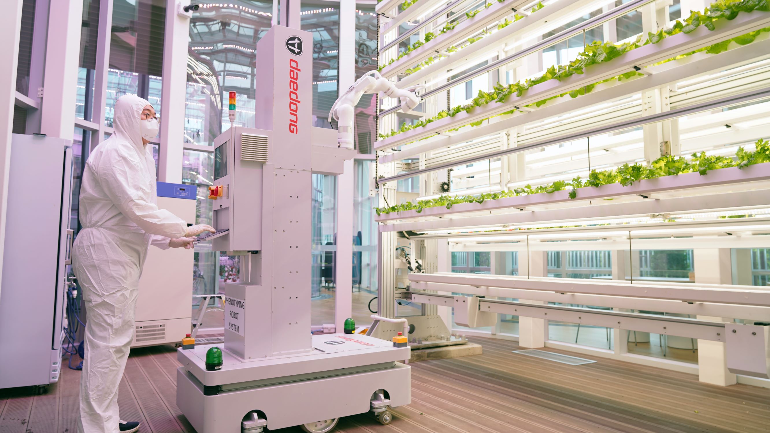 미래농업 리딩기업 대동은 스마트파밍(Smart Farming) 플랫폼 개발을 위해 ‘KT 기가(Giga) 스마트팜’을 양수한다고 30일 밝혔다. 사진은 대동 서울사무소(서초구 남부순환로)에 있는 스마트 팜에서 연구원이 농작물의 생육 상태를 촬영하는 피노타이핑(Phenotyping) 장비로 생육 데이터를 수집하고 있다.