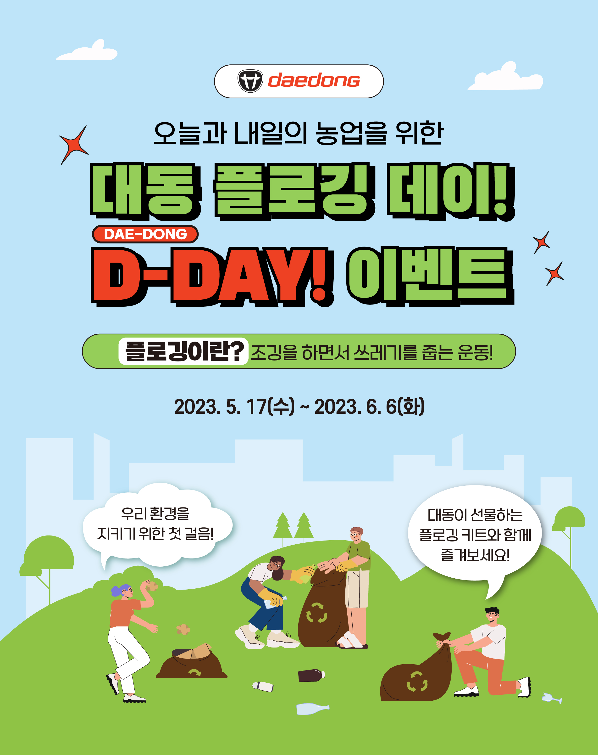 대동 인스타그램에서에서 더 나은 농업 환경을 위한 플로깅 키트 증정 및 인증 이벤트인 ▲대동 플로깅 디데이도 진행한다. 플로깅은 스웨덴어 '플로카 업'(Plocka upp, 줍다)과 영어 '조깅'(Jogging)의 합성어로 개인 또는 가족, 친구, 연인 등이 함께 걸으며 주변의 쓰레기를 수거하는 활동이다. 5월 5일부터 15일까지는 대동 인스타그램에서 플로깅을 하고 싶은 지역이나 장소를 남겨서 신청하면서 50명을 선정해 대동 플로킹 키트를 제공한다. 또 5월 17일부터 6월 6일까지 플로깅 인증 이벤트도 진행, SNS 채널에 #플로깅디데이 #대동이 그린 미래와 함께 플로깅 활동을 게재하면 추첨을 통해 20명에게 트랙터 장난감을 증정한다.