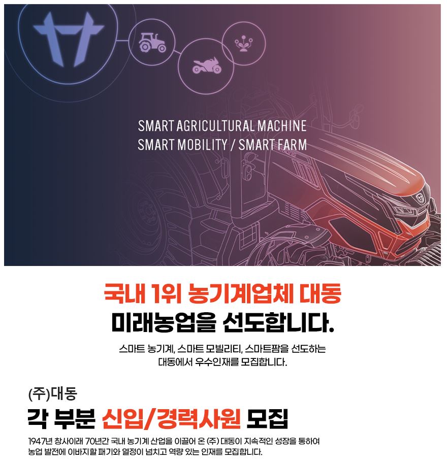 대동 이풍우 기획조정실장은 “농기계 사업의 양적/실적 성장을 위한 제조, 영업, 상품 R&D직군부터 미래 사업인 스마트 파밍 플래폼을 위한 IT&플랫폼까지 전 직무에 걸쳐 인재를 영입 육성해 대동만의 핵심 역량을 더욱 강화하고자 한다”며 “올해 상반기 약 70여명을 채용했고, 하반기 2 차 채용까지 추진해 우수 인재를 지속 확보할 계획이니 다양한 분야의 전문가들이 당사에 대한 많은 관심과 지원을 바란다"고 말했다.