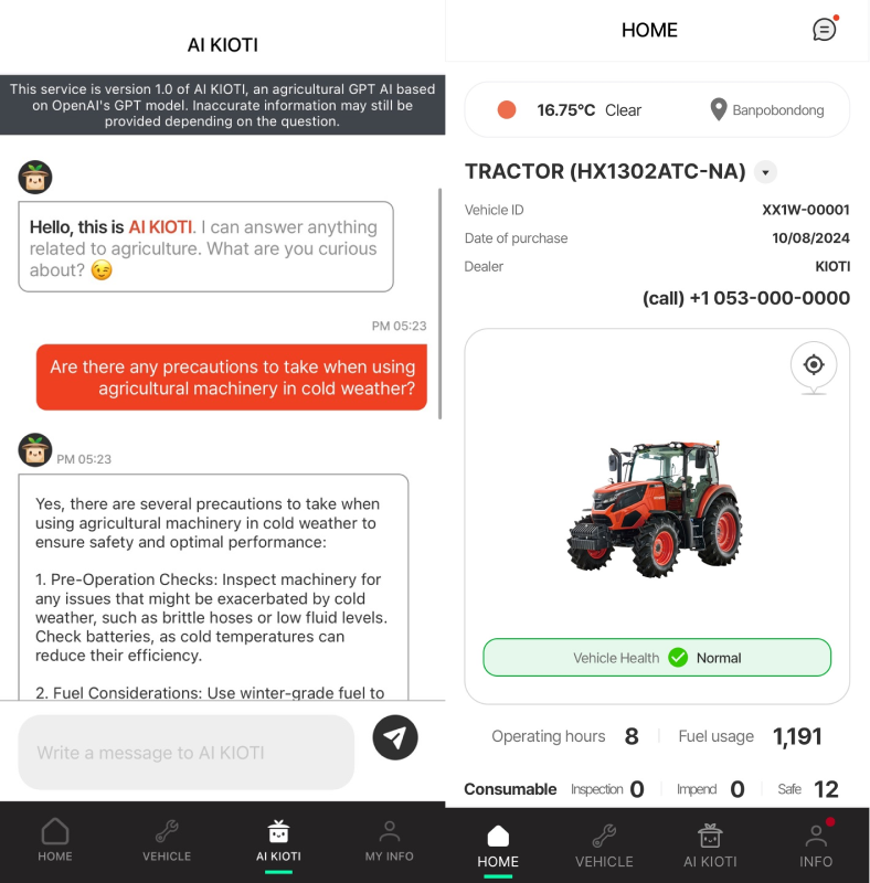 글로벌 시장에서도 국가별 농업 환경에 맞춰 솔루션을 제공하는 농업 AI 비서로 만드는 것을 목표로 하고 있으며, ▲농기계 원격 관제 서비스 ▲스마트 원격 진단 서비스 ▲농업 LLM 챗GPT서비스 ‘AI KIOTI’를 이용 가능한 ‘카이오티 커넥트’를 북미에 먼저 오픈한 것이다. 이 앱 구글 플레이 스토어, 애플 앱스토어에서 무료로 다운 받을 수 있다.