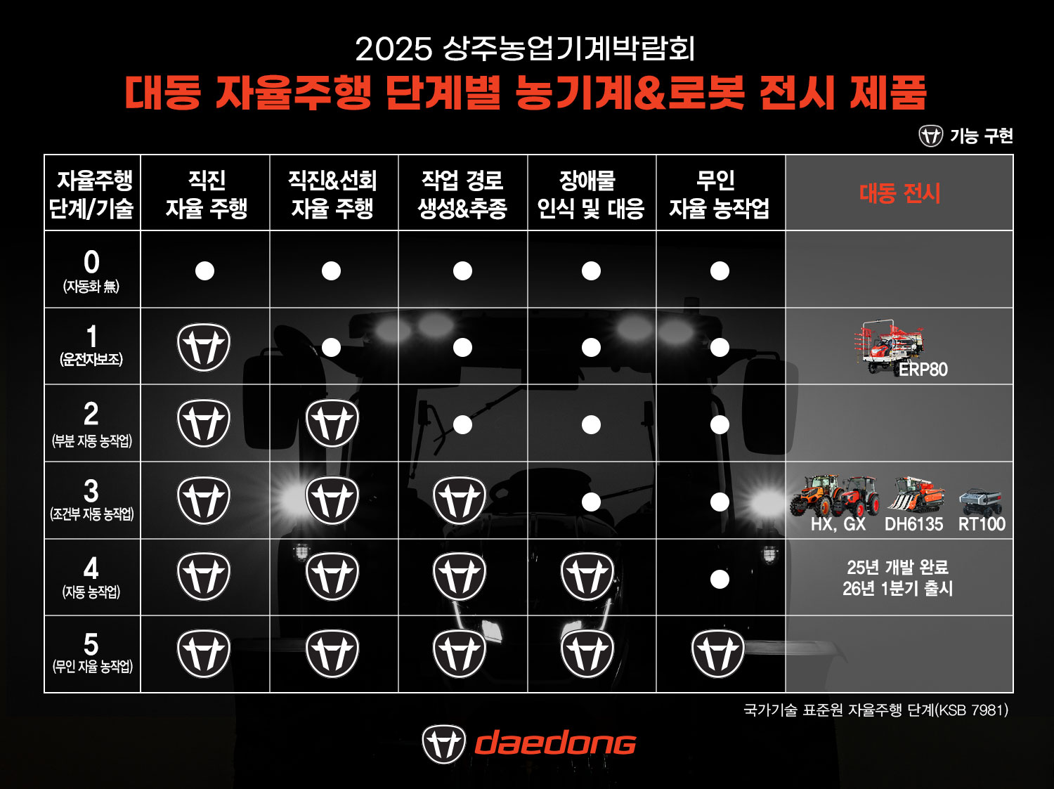 3월 25일부터 28일까지 경북 상주시 태평성대 경상감영공원에서 열리는 2025 상주 농업기계 박람회는 농기자재산업 활성화를 도모하기 위해 격년 주기로 열리는 국내 대표 농업 행사 중 하나다. 대동은 국내 업계에서 유일하게 자율주행 기능의 트랙터, 콤바인, 이앙기과 자율작업 운반로봇을 양산 판매하는 기업으로 이 제품들을 이번 전시회에서 모두 선보인다.