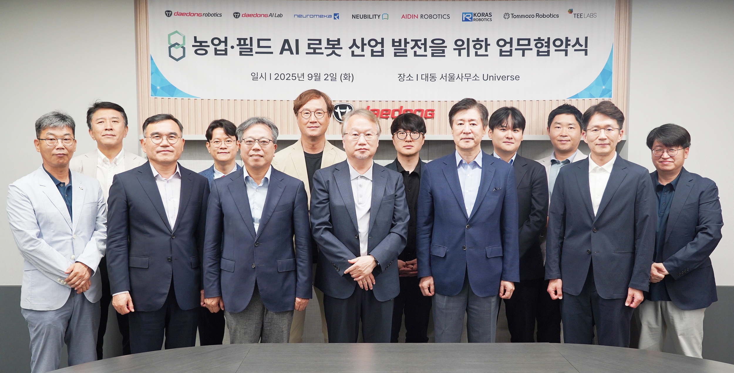 대동그룹의 AI 로봇 전문기업 대동로보틱스(공동대표 원유현·여준구)와 AI로봇 SW전문기업 대동에이아이랩(대표 최준기)이 지난 2일 대동 서울사무소에서 국내 유수의 AI·로봇 기술 기업들과 함께 ‘농업·필드 AI 로봇 산업 발전 협의체(이하 협의체)’ 출범식을 갖고, 산업 경쟁력 강화를 위한 협력 양해각서(MOU)를 체결했다고 3일 밝혔다.