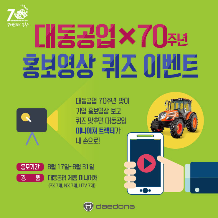대동뉴스 대동공업 X 70주년 홍보영상 퀴즈 이벤트(8/17~31) 2017-08-17 | 조회수 2,800 이벤트 참여는 대동공업 공식 블로그[비밀댓글]로 응모해주세요!많은 참여 바랍니다!▼Lee사원의 다이어리 바로가기 클릭!▼