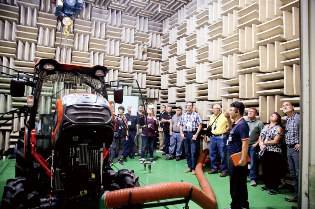 <사진1> 대동공업은 북미 20개 우수 대리점의 딜러40명을 9월6일(수)부터 14일(목)까지 8박 9일의 일정으로 한국으로 초청해 ‘북미 우수 딜러 패밀러 행사’를 진행했다. 사진은 지난 7일 북미 딜러들이 대동공업 창녕연구소를 견학하며 트랙터의 소음 테스트에 대한 대동공업 연구원의 설명을 듣고 있다.