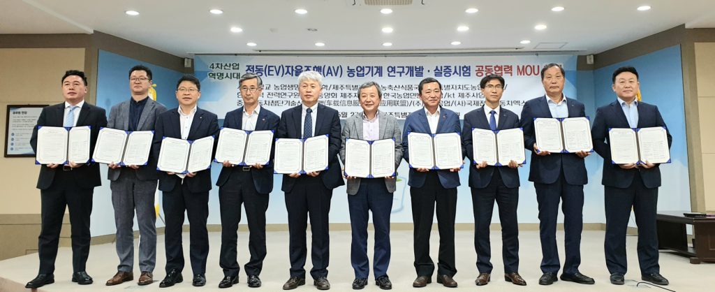 - 농업, 통신, 전력, 자동차 분야의 산‧학‧연‧관 10개 기관이 참여하는 MOU 체결 - 서울대 농생명대, 한국전력 전력연구원, 한국농업인단체연합, 제주시 농업기술원 참여 - 전동(EV) 자율주행(AV) 농업기계 연구개발 및 현장 실증을 위한 협력 추진