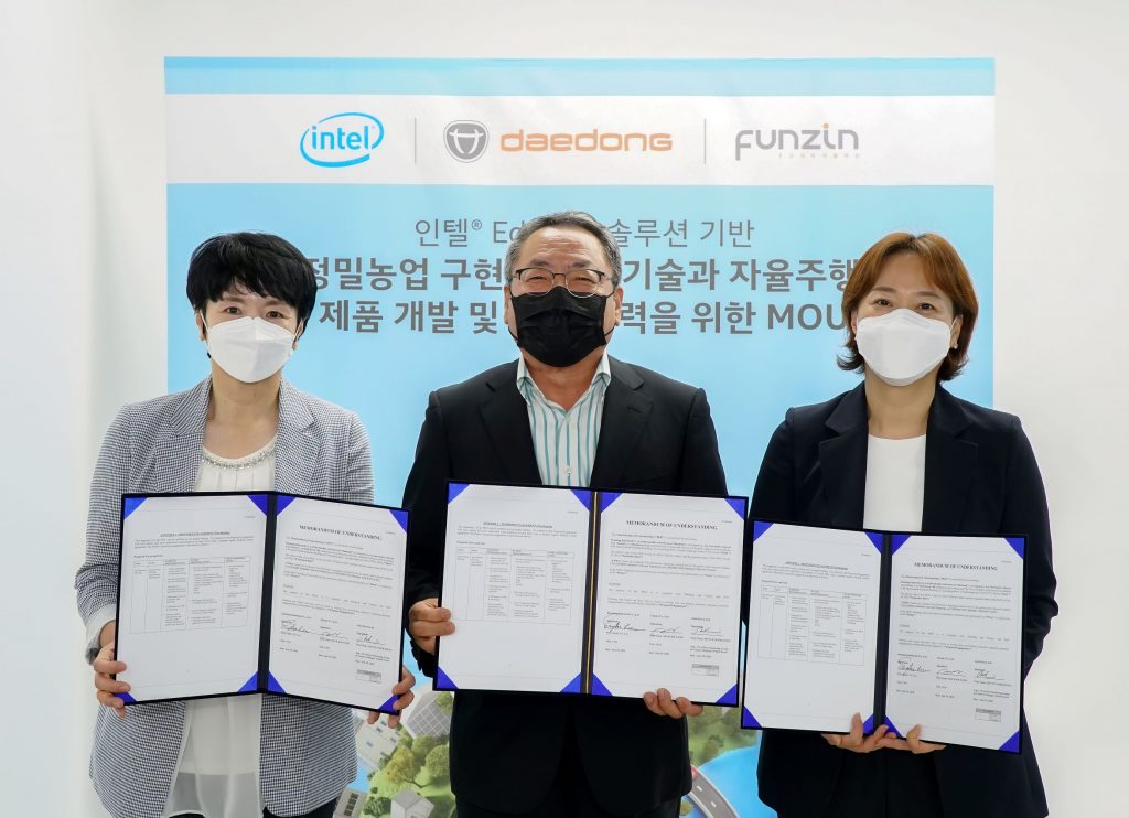 국내 1위 농기계 기업 대동공업(공동대표이사 김준식, 원유현)은 29일 인텔코리아(사장 권명숙)와 소프트웨어 개발 기업 ㈜펀진(대표이사 김득화)과 함께 ‘농기계 자율주행, 정밀농업 기술개발 및 상호교류 활성화를 위한 MOU’를 체결했다고 29일 밝혔다.