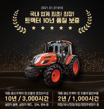 국내 1위 농기계 기업 대동공업(공동대표이사 김준식, 원유현)은 국내 농기계 업체 최초로 자체 생산하는 트랙터의 엔진과 미션에 한해 업계 최장 기간인 10년/3,000 시간의 무상 품질보증을 시행한다고 14일 밝혔다. 지난 2018년에 대동공업은 트랙터 엔진과 미션에 있어 5년/1,500무상 품질보증 정책을 도입했다. 이 후 3년 만인 2021년 1월 1일부로 기간을 2배 늘린 국내 농기계 업체 최초이자 최장인 10년/3,000 시간의 품질보증을 시행한다. 관련해 엔진은 실린더 블록, 실린더 헤드, 오일팬, 커넥팅로드 등이 해당되며(엔진 주변장치 및 전장부를 제외한 엔진 부품), 미션은 단속, 변속, 제동, 감속, 앞,뒤차축 조합부(단,오일씰, 오링, 가스켓류는 5년/1,500시간)가 해당된다.