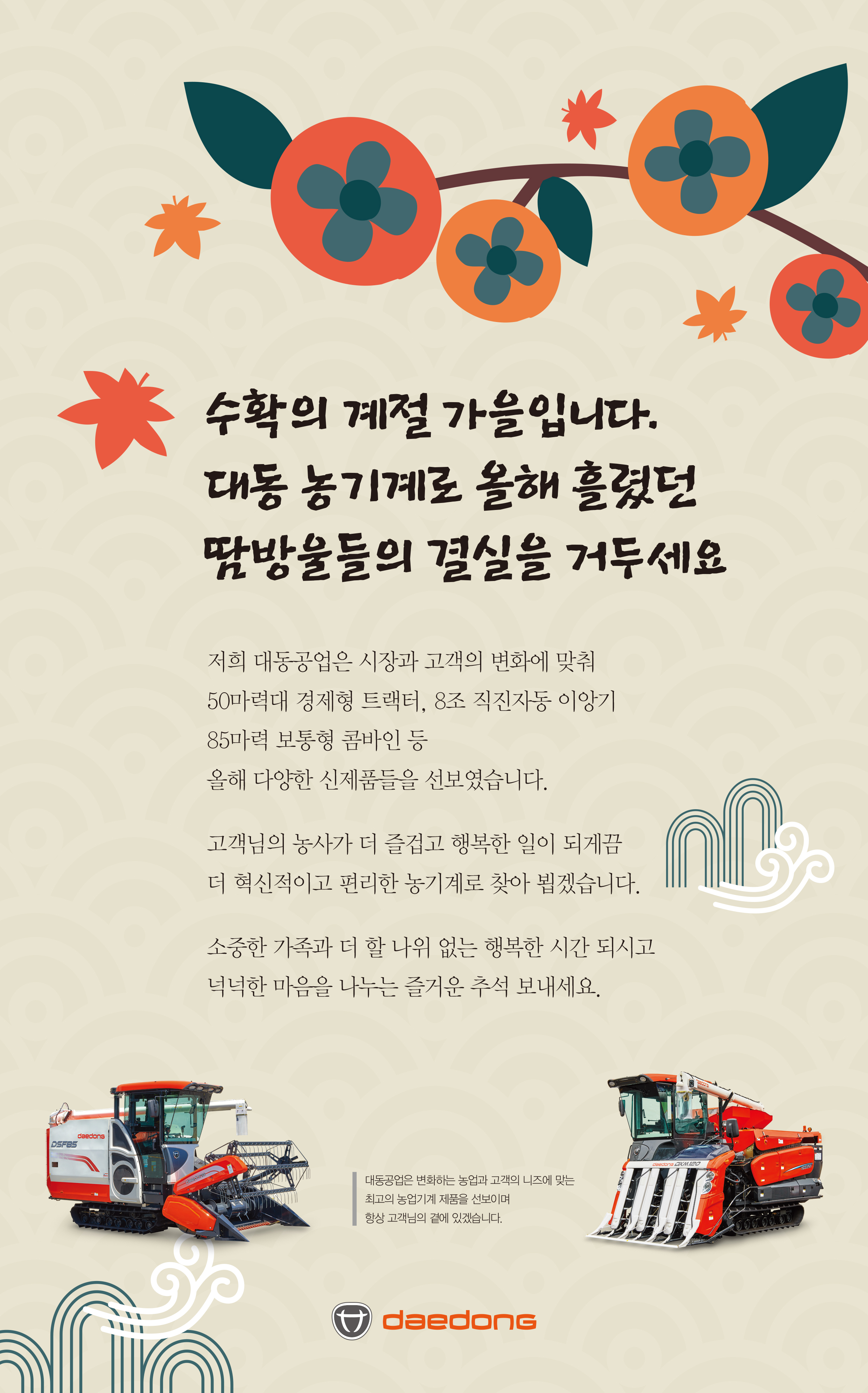 저희 대동공업은 시장과 고객의 변화에 맞춰 50마력대 경제형 트랙터, 8조 직진자동 이앙기, 85마력 보통형 콤바인 등 올해 다양한 신제품을 선보였습니다. 고객님의 농사가 더 즐겁고 행복한 일이 되게끔 더 혁신적이고 편리한 농기계로 찾아 뵙겠습니다. 소중한 가족과 더 할 나위 없는 행복한 시간 되시고 넉넉한 마음을 나누는 즐거운 추석되세요. 대동공업 드림.