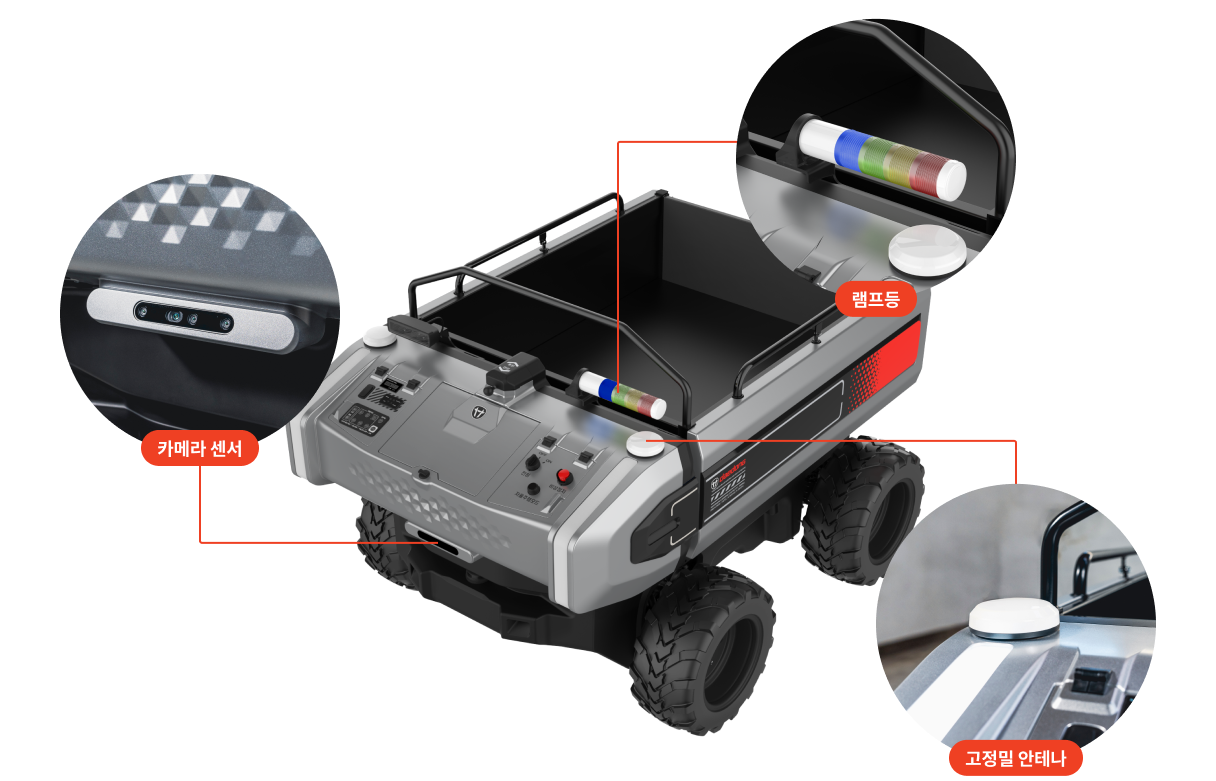 고정밀 안테나와 카메라 센서를 통해 정확하게 위치를 파악하고 세밀한 자율주행, 장애물 인식 및 비상 정지가 가능합니다.